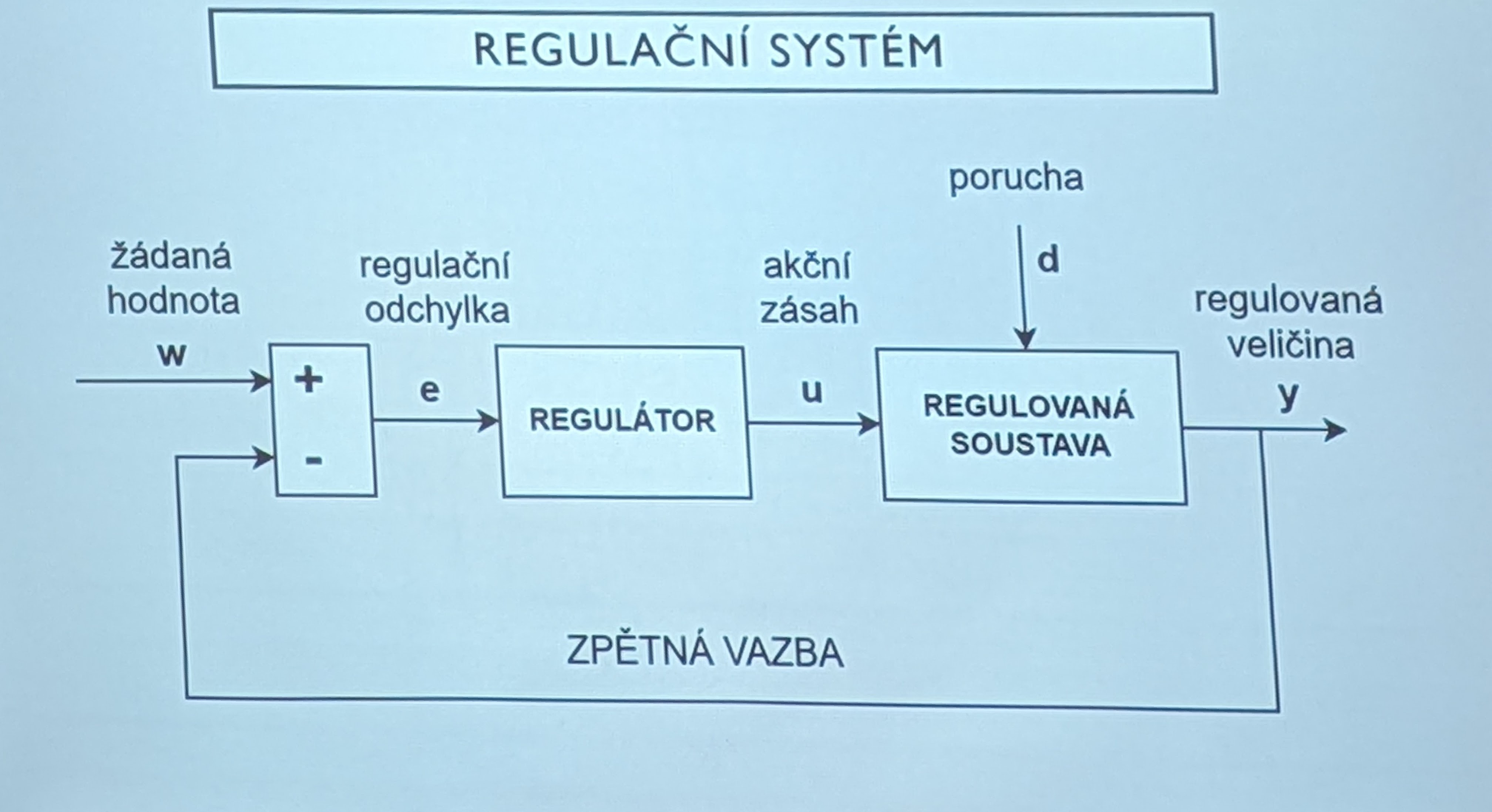 Regulační odchylka (e = w- y) - rozdíl skutečné hodnoty reg. veličiny a žádané hodnoty reg. veličiny.