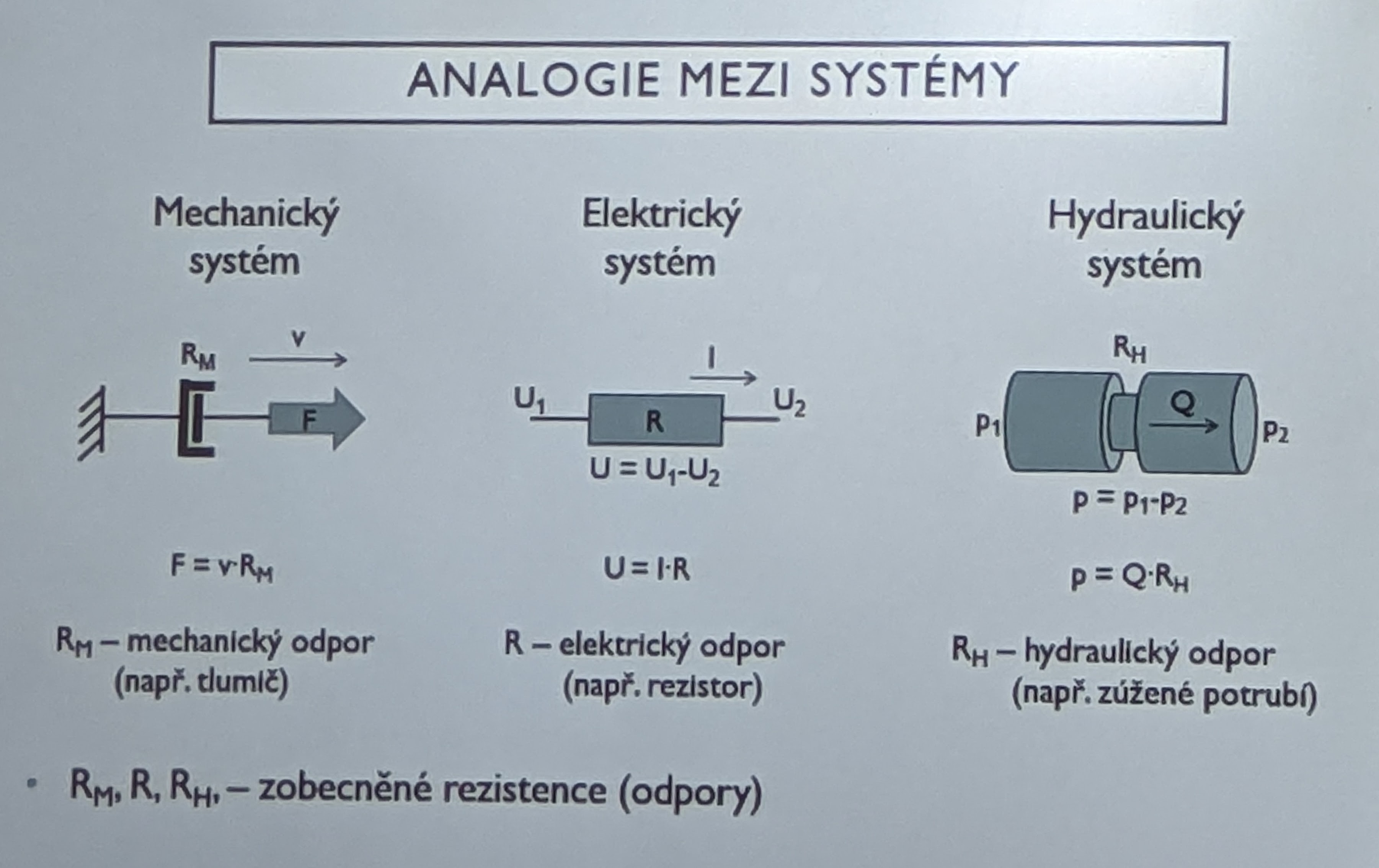- Základní veličiny popisující různé druhy systémů (různé prostředky) jsou analogické