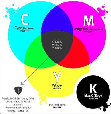 - Základní barvy jsou: azurová, purpurová a žlutá; smícháním všech těchto barev vznikne černá