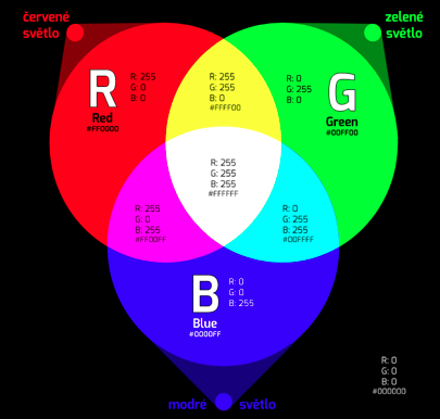 - Pracuje se třemi základními barvami: červenou, zelenou a modrou (RGB):